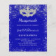 Pour une élégante mascarade, Quinceañera, 15e anniversaire. Un arrière - plan bleu royal. Décoré avec de la poussière de parties scintillant en faux argent et un masque masqué. Personnalisez et ajoutez un nom, un âge et des détails de la fête. Le nom est écrit avec un script de style manuscrit