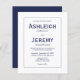 Cette faire-part de mariage simple et minimaliste présente le texte en cuivre bleu marine et en italique, encadré par une fine ligne bleue marine sur un arrière - plan blanc. L'inverse est bleu marine solide. REMARQUE : Les enveloppes ne sont pas automatiquement incluses dans ces invitations budgétaires, alors n'oubliez pas de choisir l'option "enveloppes blanches" !