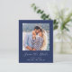 Cette simple et minimaliste carte Save the Date présente une photo carré au-dessus des mots "Save the Date" dans un élégant script d'écriture manuscrite blanche, suivie des noms du couple, de la date du mariage et de la ville en sans serif police sur un arrière - plan bleu marine. Ajoutez un message plus détaillé avec des informations supplémentaires sur l'inverse.