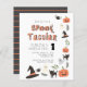 A modern and cute Halloween themed birthday party featuring hand-drawn witch hat, black cat, cute ghosts, spiders and pumpkin ensembles with dark gray and orange stripes.