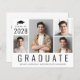 Faire-part de remise de diplômes minimaliste moderne et économique et invitation de fête avec un collage photo de 4 images, "Graduate" écrit en gros caractères et son année de classe, nom et école ou université en simple typographie. Ajoutez les détails de la partie à l'envers.