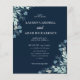 Faire-part de mariage moderne. Avec des fleurs de feuillage rustique et de minuscules fleurs bleues sur un arrière - plan bleu marine. Facile à customiser avec vos informations uniques.