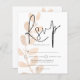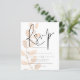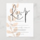 Une alternative de papier de prix budget avec un subtil arrière - plan teinté de feuilles de pêche artistique du bas au haut de la page. Les enveloppes sont en option. Une typographie stylisée en noir pour le titre principal RSVP complétant le reste du texte que vous pouvez facilement personnaliser.