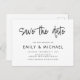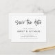 Un budget simple et moderne élégant enregistrer la carte postale mariage date faire-part. Personnalisez ce design minimaliste de faire-part de mariage en noir et blanc pour avoir vos détails personnels et votre message.