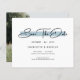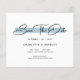 La carte d'invitation Budget Moderne Minimaliste Écriture Enregistrer La Date comprend "Enregistrer La Date" dans une élégante écriture noire sur un accent bleu moderne sur fond blanc avec vos informations d'enregistrement de date ci-dessous. Personnalisez en modifiant le texte dans les zones de texte fournies et en ajoutant votre photo préférée au verso. Conçu pour vous par ©Evco Studio www.zazzle.com/store/evcostudio