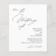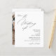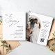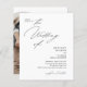 L'invitation de mariage présente un design minimaliste et élégant avec un fond blanc épuré et une combinaison de polices de caractères modernes script et serif. Le recto comprend une demande de rejoindre la célébration, avec "Le Mariage de" dans un style cursif proéminent, suivi des noms des mariés en caractères gras serif et les détails de l'événement dans un format clair et direct. Le verso présente une photo en arc du couple qui peut être personnalisée, avec le texte pour les détails de RSVP dans un script correspondant et un code QR.
