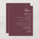Ce menu mariage simple et moderne présente du texte blanc sur un arrière - plan bordeaux foncé. Le mot "Menu" apparaît en calligraphie manuscrite stylisée. Ajoutez le nom du couple et la date du mariage dans le script et l'italique, ainsi que les détails du menu dans la police sans serif. L'envers est assorti d'une teinte bordeaux solide.