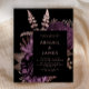 Cette faire-part de mariage élégante et moelleuse présente un bouquet luxuriant et romantique à fleurs violettes avec fausse feuille d'or rose et feuillage de parties scintillant sur un arrière - plan noir. Customisez le texte rose rose dans des polices de style sur un rectangle noir. Le dos de la carte est noir.