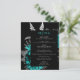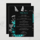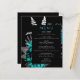 Ce menu mariage élégant et sobre présente un bouquet luxuriant et romantique à fleurs en bleu turquoise avec fausse feuille argent et feuillage de parties scintillant sur un arrière - plan noir. Customisez le texte gris argenté dans des polices stylisées sur un rectangle noir. Le dos de la carte est noir.