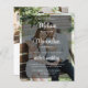 Un faire-part de mariage photo tout-en-un moderne et branché affichant vos informations mariages sur l'une de vos photos préférées avec une superposition transparente en noir et accentué par un élégant script blanc, mais avec un oeil sur le budget. Facilement personnalisable avec vos détails de cérémonie mariage en blanc pour un look romantique mais moderne et élégant. Le dos de la carte comporte une deuxième image, vos instructions RSVP en ligne et la date d'échéance, un code QR personnalisable pour diriger vos invités vers votre site Web mariage, vos monogrammes et votre date de mariage.
