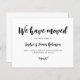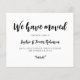 Budget Minimaliste Simple "We've Moved" (Nous avons déménagé) Typographie Whimsical Nouvelle carte de Faire-part mobile à domicile. Faites connaître votre nouvelle adresse à vos amis et à votre famille en utilisant cette carte minimaliste élégante et joliment manuscrite Calligraphie script de police "We Have Moved" texte sur le devant et sur le dos "Please keep in touch!" texte en noir et blanc. Facile à customiser avec vos propres détails.