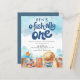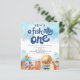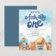 Budget Ofishally One Fishing Boy 1st Party invite. A budget priced smaller 4.5 x 5.6 inch semi-gloss similar in thickness to a postcard. Of-fish-ally One is in a set non-editable artsy script. Easily personalise the rest of the words as required. With cute watercolor illustrations.