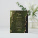 This elegant modern wedding menu features an olive green watercolor agate border trimmed with faux gold glitter. The customizable text combines gold-colored handwriting script and copperplate fonts. The reverse side features a matching olive green and gold agate design.