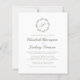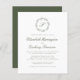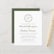 Cet élégant design d'invitation de mariage comprend un monogramme en écriteau vert olive entouré d'une couronne botanique d'art en ligne. Les noms apparaissent dans le script vert olive, avec le reste du texte dans la police serif classique. Le dos de la carte est vert olive massif.