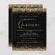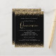 Invitation de 15 ans Quinceañera paillettes dorées noire. Une alternative de petit format à prix réduit 4,5” x 5,6”. Disponible sur du papier cartonné SEMI-BRILLANT 110 g (l’option par défaut, plus épais pour les invitations) OU sur un papier mince à FINITION SATINÉE 80 g (idéal pour les encarts). Des bordures élégantes de faux confettis pailletés dorés sont en haut et en bas ainsi que sur le dos. Quinceañera est écrit dans un style d'écriture manuscrite moderne. Personnalisez facilement le reste du texte à votre guise.