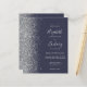 Le bord gauche de cette élégante faire-part de mariage moderne est orné d'une bordure en faux parties scintillant argenté. Le texte personnalisable combine écriture gris argenté pâle, copperplate et polices italiques sur un arrière - plan bleu foncé. L'envers est assorti d'un design bleu foncé et argenté.