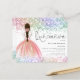 Multicolor Parties scintillant Gown Quinceanera Invitation. Un prix économique PETIT 4,5 po x 5,6 po alternatif. Disponible dans un STOCK CARTE SEMI GLOSS 110 lb qui est l'option par défaut (plus épais pour les invitations), OU un STOCK PAPIER THINNER SATIN FINISH 80 lb (idéal pour les enceintes). Les enveloppes sont en option et légèrement plus grandes que la taille de la carte. Elégance pétillante pour votre Quinceanera avec une illustration de la vue arrière d'une fille aux cheveux tressés dans une belle robe rose boule et parties scintillant de couleur arc-en-ciel bordant le haut et le bas de chaque côté. L'en-tête principal est dans un script de style manuscrit et personnalise facilement le reste du texte à vos détails.