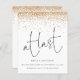 Un rapport qualité-prix BUDGET alternative sur une taille plus petite 4,5 x 5,6" semi-brillant poids 110lbs, qui est d'une épaisseur similaire à une carte postale (cependant ne convient pas à l'utilisation comme carte postale.) VEUILLEZ NOTER qu'il y a UN invitation par feuille. Budget parties scintillant Or Confetti À Dernier Faire-part Fiançailles. Une typographie stylisée en noir pour At Dernier complétant le reste du texte que vous pouvez facilement personnaliser, avec une bordure de faux confettis de parties scintillant en haut des deux côtés.