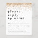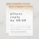 Parties scintillant d'or Confetti Script Wedding RSVP. Un prix économique PETIT 4,5 po x 5,6 po alternatif. Disponible dans un STOCK CARTE SEMI GLOSS 110 lb qui est l'option par défaut (recommandé pour les invitations), OU un STOCK PAPIER THINNER SATIN FINISH 80 lb (idéal pour les boîtiers). Les enveloppes sont en option et légèrement plus grandes que la taille de la carte. L'en-tête est grand en bas en minuscule élégant avec les détails en bas avec une bordure en parties scintillant d'or en haut de chaque côté. Personnalisez facilement le texte à vos propres détails.