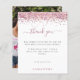 Parties scintillant rose Photo Merci de la fête d'Hen. Un prix économique PETIT 4,5 po x 5,6 po alternatif. Disponible dans un STOCK SEMI-GLOSS 110 lb CARD qui est l'option par défaut (plus épais pour les invitations), OU un STOCK SATIN FINISH 80 lb THINNER PAPER (idéal pour les boîtiers). Les enveloppes sont en option et légèrement plus grandes que la taille de la carte. Une fausse bordure de parties scintillant rose est en haut, et le Merci est dans un script élégant. Personnalisez facilement le texte à vos propres détails. Sur le dos échange dans votre photo préférée de votre parti d'orientation portrait.