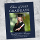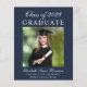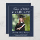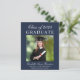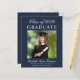 Un faire-part d'obtention du diplôme de l'université bleu foncé, abordable, avec la photo du diplômé, son nom et son année de classe dans un élégant script blanc et son université, majeure et honneurs dans la typographie blanche moderne.