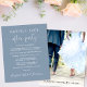 Étage bleu poussiéreux et économique ou petit faire-part mariage pour informer la famille et les amis que vos plans de mariage ont changé, et vous avez fui ou réduit le nombre d'invités à votre mariage, et de les invitations à une réception de mariage ou fête. L'avant présente "Happily Ever After Party" dans un mélange de typographie blanche simple et d'un élégant script blanc avec des swashes, et vous pouvez personnaliser votre message et invitation en détail et vos noms dans un script signature. Au verso, vous trouverez votre photo de mariage préférée, vos prénoms et votre date de mariage.
