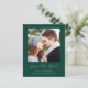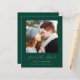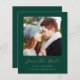 Cette simple et minimaliste carte Save the Date présente une photo carré au-dessus des mots "Save the Date" dans un élégant script d'écriture dorée, suivi des noms du couple, date mariage et ville en sans serif police sur un arrière - plan vert émeraude. Ajoutez un message plus détaillé avec des informations supplémentaires sur l'inverse.