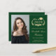 Faire-part de diplôme d'études supérieures vertes avec "Classe de" dans une illustration en or d'une couronne de laurier incorporant un haut casquette et un diplôme, une photo du diplômé et leur nom dans un élégant script en or. Ajoutez leur école, major, distinctions honorifiques ou plans d'avenir dans la typographie classique de la serif d'or. Ce papier semi-brillant budgétaire est similaire en poids au papier photo. Une version plus grande de 5x7 traditionnelle carte stock est également disponible (message nous pour le lien).