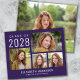 Faire-part de graduation violet abordable avec un collage photo de 4 images sur le devant et une photo complète sur le dos. Ajoutez l'année de classe, le nom du diplômé et l'école ou l'université en typographie blanche moderne minimale.