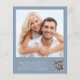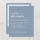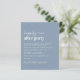 Invitation à la réception de mariage bleu poussiéreux avec "Happily Ever After Party" dans un mélange d'un script blanc contemporain et de lettres blanches modernes et audacieuses, votre invitation et vos noms dans un script signature. Au verso, téléchargez votre photo et entrez l'adresse de votre site Web mariage pour créer un code QR pour que vos invités puissent scanner en ligne vers RSVP et obtenir des détails mariages supplémentaires. Ce papier semi-brillant budgétaire est similaire en poids au papier photo. Une version plus grande de 5x7 traditionnelle carte stock est également disponible (message nous pour le lien).