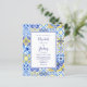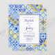 Ce design rustique présente un motif arrière - plan de carreaux portugais bleu, jaune et blanc d'aquarelle, ou azulejos. Personnalisez-le avec les noms de la mariée et du marié dans le script de calligraphie bleu et le texte restant dans une combinaison de sans serif, de cuivre et d'italique sur un rectangle blanc à la frontière bleue. Un motif de mosaïque correspondant apparaît à l'envers. REMARQUE : Les enveloppes ne sont pas automatiquement incluses dans ces invitations budgétaires, alors n'oubliez pas de choisir l'option "enveloppes blanches" !