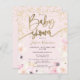 Fête de baby shower à petit budget avec aquarelle florale décontractée pastel doux, avec arrangement de fleurs peintes à la main en rose, jaune et pêche pastel clair, et calligraphie script moderne et chic avec confettis pailletés dorés, et un script élégant doré.