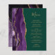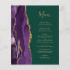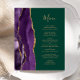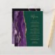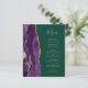 Le bord gauche de cet élégant menu mariage moderne comporte une bordure d'aquarelle violette ornée d'une parties scintillant en faux or. Le texte personnalisable combine écriture manuscrite couleur or et polices de cuivre sur un arrière - plan vert émeraude. L'envers est assorti d'une agate violette et dorée.