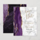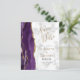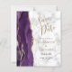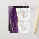Le bord gauche de cet élégant mariage moderne, sauf la carte de date, est doté d'une bordure d'aquarelle violette ornée d'une parties scintillant en faux or. Le texte personnalisable associe écriture manuscrite noire et dorée, polices cuivre et italique sur un arrière - plan gris et blanc en marbre. L'envers est assorti d'une agate violette et dorée.