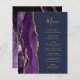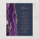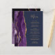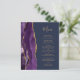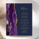 Le bord gauche de cet élégant menu mariage moderne comporte une bordure d'aquarelle violette ornée d'une parties scintillant en faux or. Le texte personnalisable combine écriture manuscrite couleur or et polices de cuivre sur un arrière - plan bleu marine. L'envers est assorti d'une agate violette et dorée.
