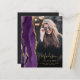 Ce faire-part de graduation 2025 branché présente une bordure de géode d'aquarelle dans les tons violet avec des reflets de parties scintillant en faux or. Le prénom du diplômé apparaît comme une élégante écriture manuscrite de couleur or superposée sur une photo verticale, avec le nom de famille, l'école et l'année de classe en cuivre. Un filtre dégradé noir aide le texte à apparaître. Une deuxième photo horizontale apparaît au dos, ainsi que la faire-part et les détails en texte doré sur un arrière - plan noir foncé.