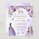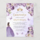 Cette jolie invitation de quinceañera comporte une bordure de fleurs violettes et d'ivoire sur un arrière - plan d'aquarelle violet pâle. Une tiara dorée, une fille aux cheveux foncés en robe de princesse violette et de petits papillons violets ornent le texte. Le mot "Quinceañera" et le nom de l'invité d'honneur apparaissent dans un élégant script d'écriture manuscrite de couleur or, avec le texte restant en gris sans serif.