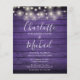 Un élégant faire-part de mariage à budget rustique avec de jolies lampes à cordes, des noms de style signature et une typographie chic sur un arrière - plan rustique en bois violet et votre photo spéciale au verso. Conçu par Thisisnotme©