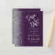 Le bord gauche de cet élégant mariage moderne, à l'exception de la carte de date, comporte une bordure en faux parties scintillant argent. Le texte personnalisable combine écriture manuscrite gris argent et police sans serif sur un arrière - plan violet foncé. L'envers est assorti d'un design violet et argenté.