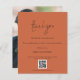 Script QR Code Mariage Galerie photo Terracotta Merci. Un prix économique PETIT 4,5 po x 5,6 po alternatif. Disponible dans un STOCK SEMI-GLOSS 110 lb CARD qui est l'option par défaut (plus épais pour les invitations), OU un STOCK SATIN FINISH 80 lb THINNER PAPER (idéal pour les boîtiers). Les enveloppes sont en option et légèrement plus grandes que la taille de la carte. Un design minimaliste de typographie avec un ensemble de style design d'écriture manuscrite pour le Merci. Sur le dos, remplacez l'exemple de photo par votre préféré de la journée comme souvenir pour vos invités. Personnalisez facilement le reste du texte avec votre message et vos noms et remplacez l'exemple de code QR par votre propre menant à votre galerie photo mariage en ligne.