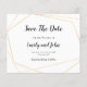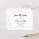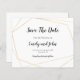 QR Code Simple Gold Géométrique Enregistrer La Date. Un prix économique PETIT 4,5 po x 5,6 po alternatif. Disponible dans un STOCK SEMI-GLOSS 110 lb CARD qui est l'option par défaut (plus épais pour les invitations), OU un STOCK SATIN FINISH 80 lb THINNER PAPER (idéal pour les boîtiers). Ajoutez votre code QR à votre site Web mariage au verso en remplaçant le code QR de l'exemple. Ce design élégant a un cadre géométrique or simple avec du texte noir. Le texte est facilement personnalisé et les couleurs de l'arrière - plan et du texte peuvent être modifiées si vous le souhaitez