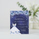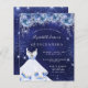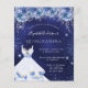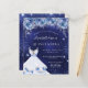 Une invitation moderne, élégante et glamour pour une Quinceañera, 15ème anniversaire. Un arrière - plan bleu nuit avec de la poussière de parties scintillant imitation, une robe et des fleurs bleues. La couleur bleue est inégale. Le nom est écrit avec un script de style moderne écrit à la main. Personnalisez et ajoutez les détails de votre fête.