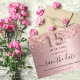 Une petite fille et tendance Enregistrer la carte Date pour une Quinceañera, 15e anniversaire fête. Arrière - plan à l'apparence métallique rose pâle décoré de poussière de parties scintillant imprécise. Personnalisez et ajoutez une date et un nom/texte. Le texte : Save the Date est écrit avec un grand script de style à la main tendance avec des swashes. Numéro 15 avec police de style ballon de couleur or rose.