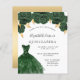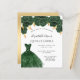 Une invitation moderne, élégante et glamour pour une Quinceañera, 15ème anniversaire. Sur le devant : Un arrière - plan blanc avec de la poussière de parties scintillant en faux vert, une robe vert émeraude et des roses verts, des fleurs. Le nom est écrit avec un script de style moderne écrit à la main. Personnalisez et ajoutez les détails de votre fête. Dos : faux arrière - plan or.