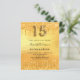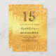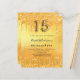 Une invitation moderne, élégante et glamour pour une Quinceañera, 15ème anniversaire. Un arrière - plan à l'apparence métallique en faux or avec des gouttes de parties scintillant, la peinture goutte à goutte. Le nom est écrit avec un script de style moderne écrit à la main. Personnalisez et ajoutez les détails de votre fête. Le numéro 15 est écrit avec une police de style ballon, script.