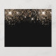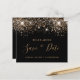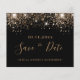 Une petite fille et tendance Enregistrer la carte Date pour une Quinceañera, 15e anniversaire fête. Un arrière - plan noir décoré de parties scintillant en faux or. Modèles pour une date, un nom et un texte. Lettres de couleur dorée. Le texte : Save the Date est écrit avec un grand script de style à la main tendance.