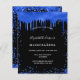 Quinceañera, une Quinceañera, 15ème anniversaire. Devant : Un arrière - plan noir chic. Décoré avec des gouttes de parties scintillant bleu royal, la peinture goutte à goutte. Personnalisez et ajoutez un nom et des détails du parti. Le nom est écrit avec un script de style écrit à la main.