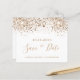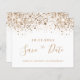 Une petite fille et tendance Enregistrer la carte Date pour une Quinceañera, 15e anniversaire fête. Un élégant arrière - plan blanc décoré avec de la poussière de parties scintillant en faux or. Personnalisez et ajoutez une date, un nom et un texte. Lettres de couleur dorée. Le texte : Save the Date est écrit avec un grand script de style à la main tendance.