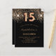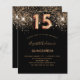Une invitation moderne, élégante et glamour pour une Quinceañera fille, 15e anniversaire fête. Un arrière - plan noir décoré de faux parties scintillant. Le nom est écrit avec un script de style à la main de couleur dorée moderne. Personnalisez et ajoutez les détails de votre fête. Le numéro 15 est écrit avec une police de style ballon, script.
