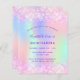 Une Quinceañera féminine et féminine, 15ème anniversaire invitation à la fête. Devant : Un arc-en-ciel, arrière - plan de couleur holographique en violet, rose, vert menthe, or rose. Décoré de faux parties scintillant rose vif, brille. Personnalisez et ajoutez un nom et des détails du parti. Le nom est écrit avec un script de style écrit à la main, des lettres de couleur violette.